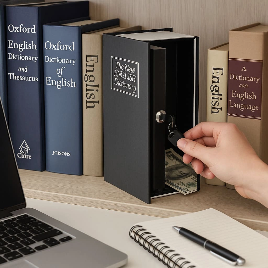 Kasetka na pieniądze książka 240×155×55 mm na kluczyk to dyskretny i praktyczny schowek w formie książki, idealny do przechowywania gotówki, dokumentów, biżuterii czy drobnych przedmiotów wartościowych. Dzięki wyglądowi zwykłej książki, sejf można ukryć w domowej biblioteczce, biurze lub pokoju, zwiększając bezpieczeństwo przechowywania. Wewnątrz znajduje się metalowa kasetka zamykana na kluczyk (2 klucze w zestawie).
