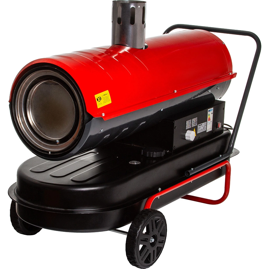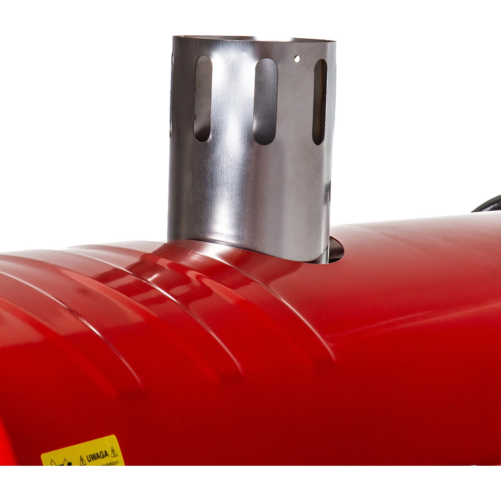 Nagrzewnica została wyposażona w metalową obudowę oraz stalowy element grzejny, co gwarantuje trwałość i wysoką odporność na warunki pracy. Urządzenie posiada wbudowany komin do odprowadzania spalin, a wygodny system regulacji temperatury działa dzięki termostatowi i precyzyjnemu pokrętłu nastawczemu.