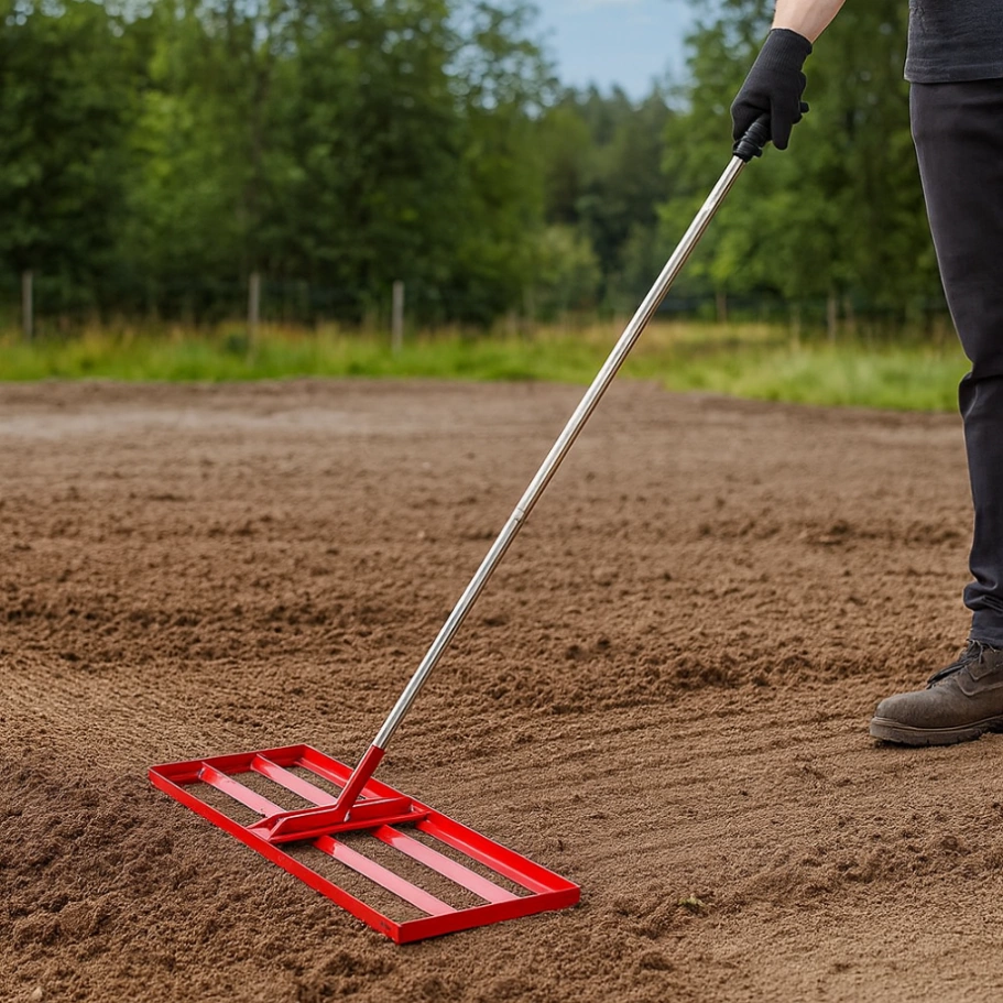 Niwelator terenu ręczny oprawiony 90×30×174 cm to solidne i wytrzymałe narzędzie przeznaczone do wyrównywania podłoża podczas prac ogrodowych, brukarskich i budowlanych. Dzięki masywnej konstrukcji i odpowiednio zaprojektowanej geometrii skutecznie zgarnia materiał, ułatwiając przygotowanie powierzchni pod kostkę brukową, trawniki czy rabaty.