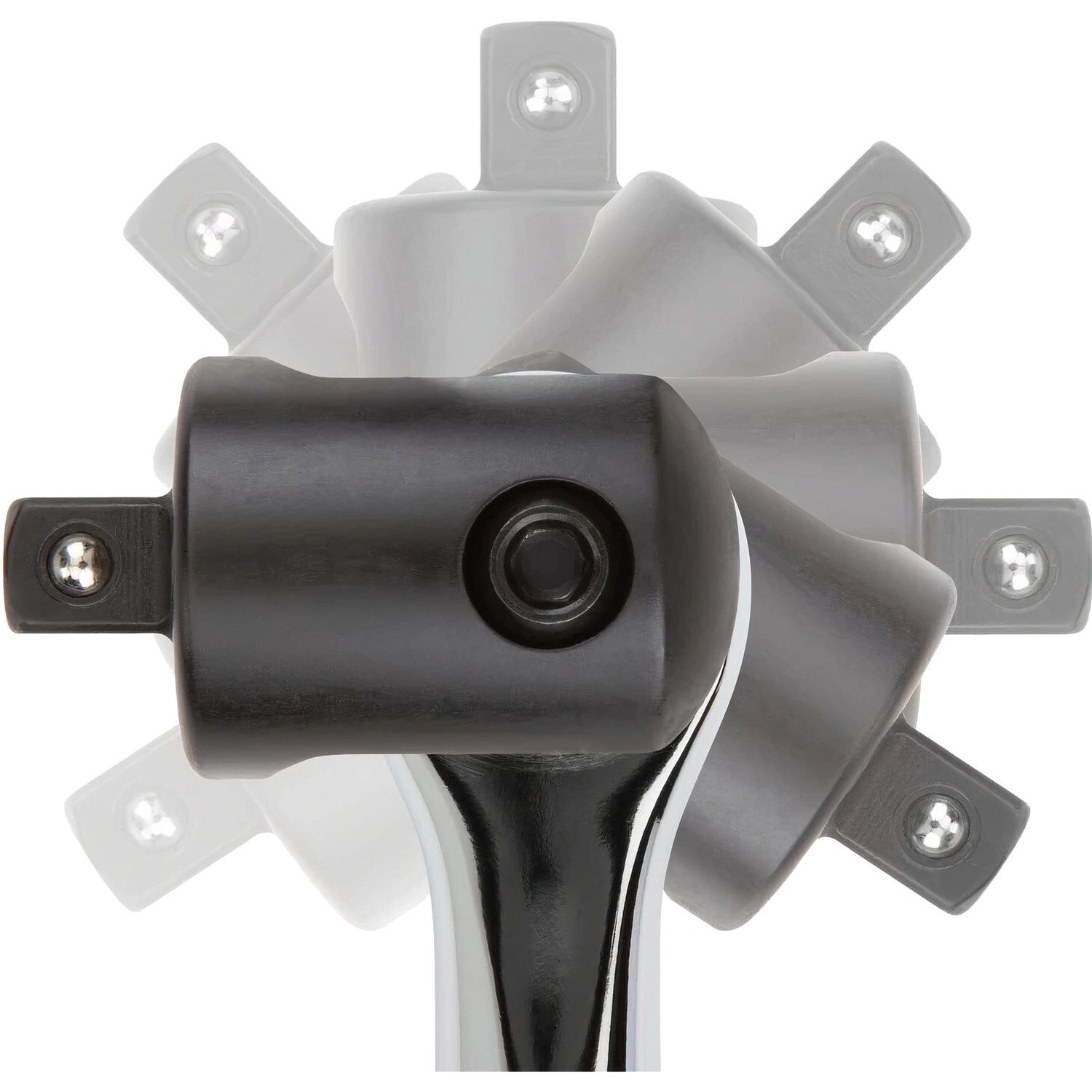 Pokrętło przegubowe łamane 1/2" 750 mm to profesjonalne narzędzie warsztatowe stworzone z myślą o pracy w trudnych warunkach i przy mocno dokręconych połączeniach. Dzięki długości 750 mm zapewnia dużą dźwignię, co pozwala uzyskać znacznie większy moment obrotowy niż w tradycyjnych grzechotkach. Przegub uchylny umożliwia pracę pod różnymi kątami, co czyni je niezwykle praktycznym w ciasnych przestrzeniach.