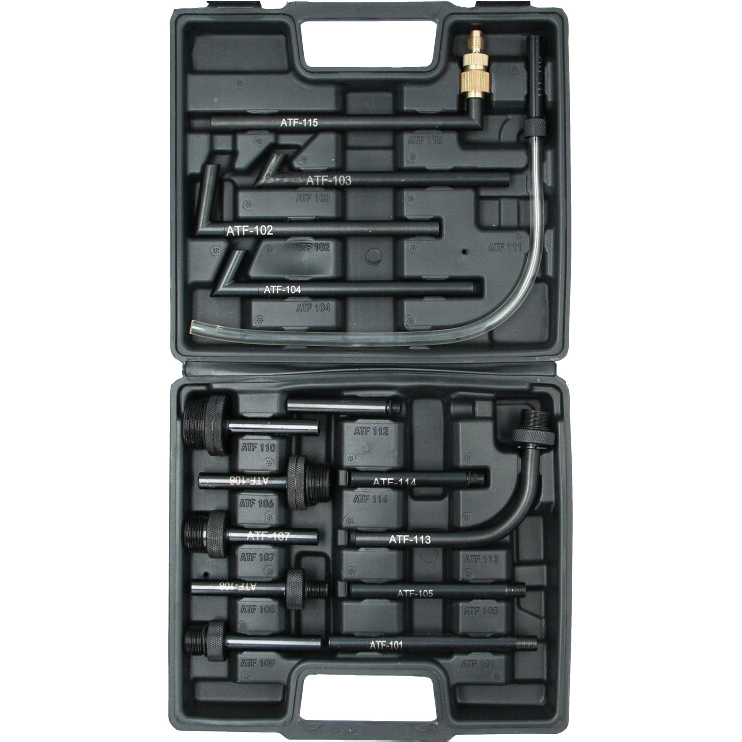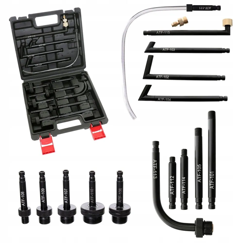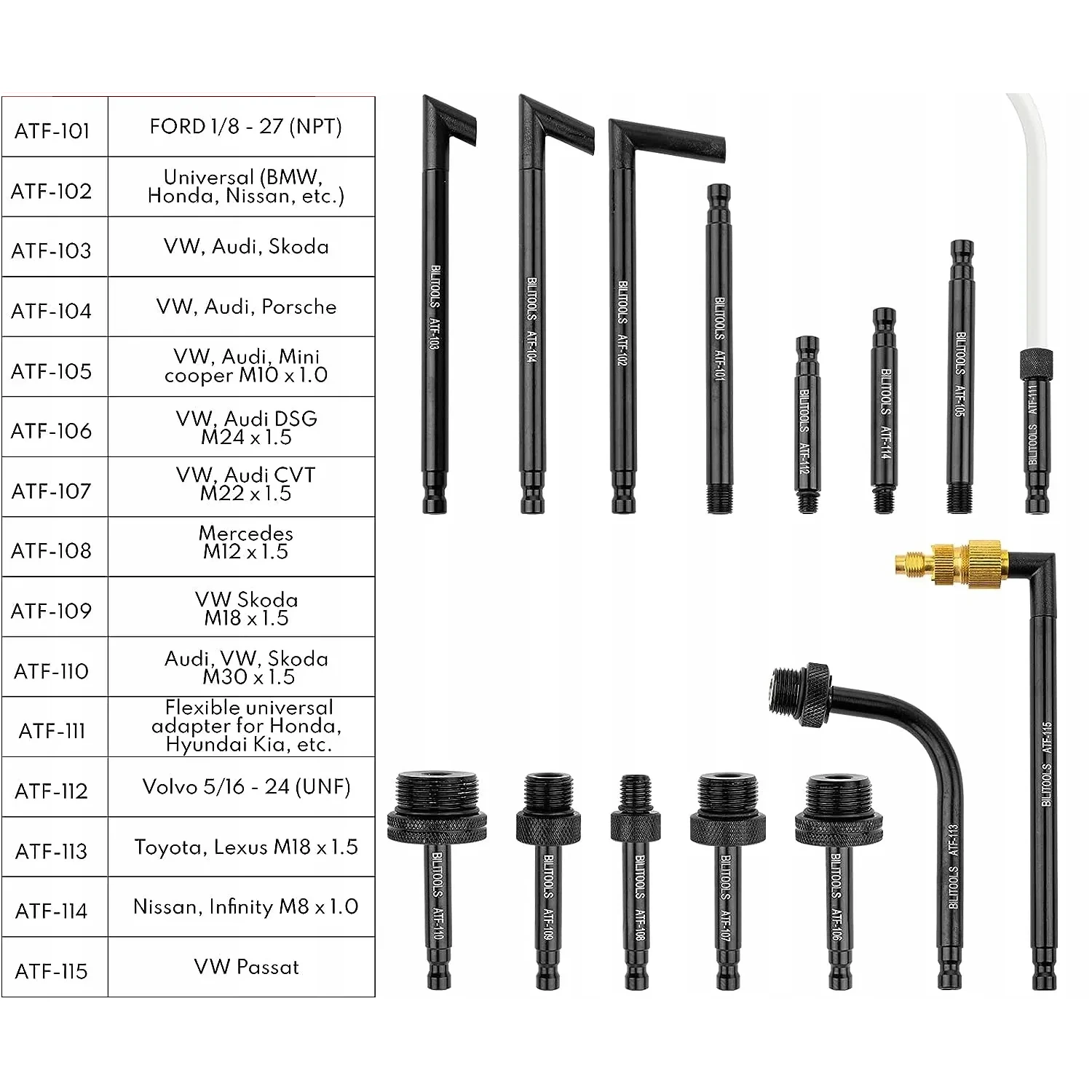 ATF-101 (Ford 1/8–27 NPT), ATF-102 (BMW, Honda, Nissan), ATF-103 (VW/Audi, Skoda), ATF-104 (VW/Audi, Porsche), ATF-105 (VW/Audi, Mini Cooper M10x1.0), ATF-106 (VW/Audi DSG M24x1.5), ATF-107 (VW/Audi CVT M22x1.5), ATF-108 (Mercedes M12x1.5), ATF-109 (VW, Skoda M18x1.5), ATF-110 (Audi/VW, Skoda M30x1.5), ATF-111 (Honda, Hyundai, Kia – elastyczny 300 mm), ATF-112 (Volvo 5/16–24 UNF), ATF-113 (Toyota, Lexus, BMW 7 Series M18x1.5), ATF-114 (Nissan, Infinity M8x1.0), ATF-115 (VW Passat)