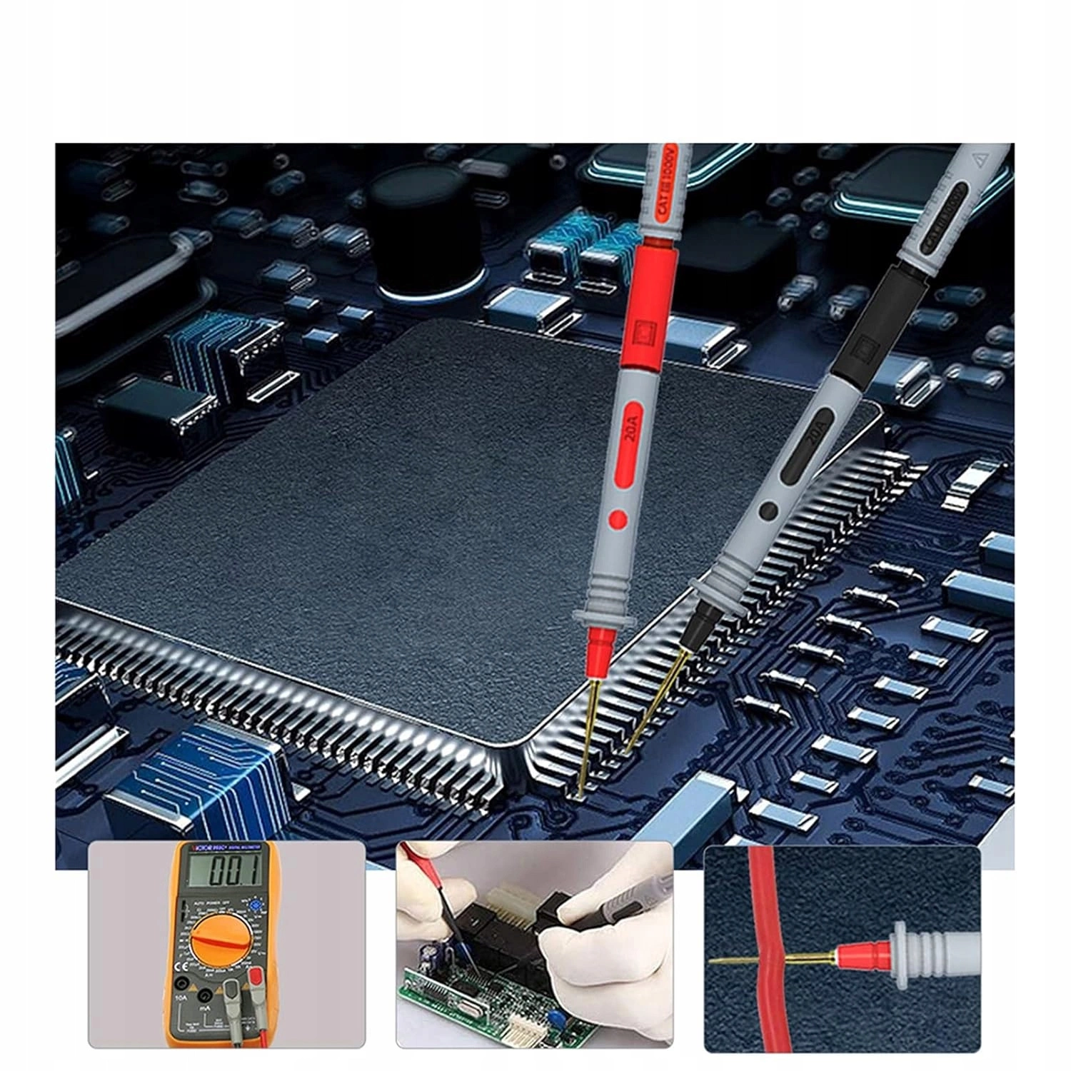 Przewody pomiarowe do sondy multimetru zestaw, 21el to zestaw przeznaczony do pracy w warsztatach samochodowych, serwisach elektronicznych oraz garażach domowych. Dzięki wymiennym końcówkom umożliwia precyzyjne pomiary elementów elektronicznych.