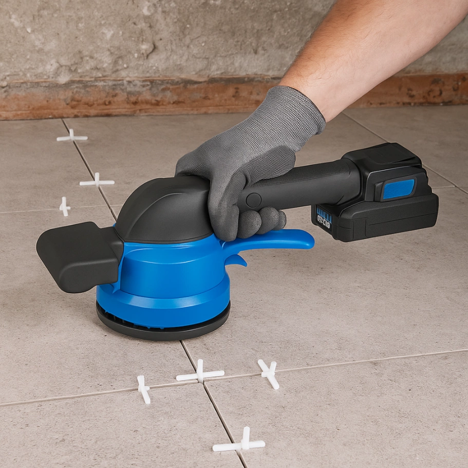 Przyssawka wibrująca akumulatorowa do układania płytek – zestaw z ładowarką i 2 x akumulator 2000mAh 18V to profesjonalne narzędzie do przenoszenia i montażu płytek ceramicznych. Urządzenie nie tylko ułatwia transport, ale również dzięki wibracjom umożliwia równomierne rozprowadzenie kleju oraz usunięcie pęcherzyków powietrza, co zapobiega powstawaniu pustych przestrzeni i gwarantuje trwałe połączenie płytki z podłożem. Regulacja częstotliwości wibracji sprawia, że sprzęt można dopasować do różnych rodzajów prac glazurniczych.