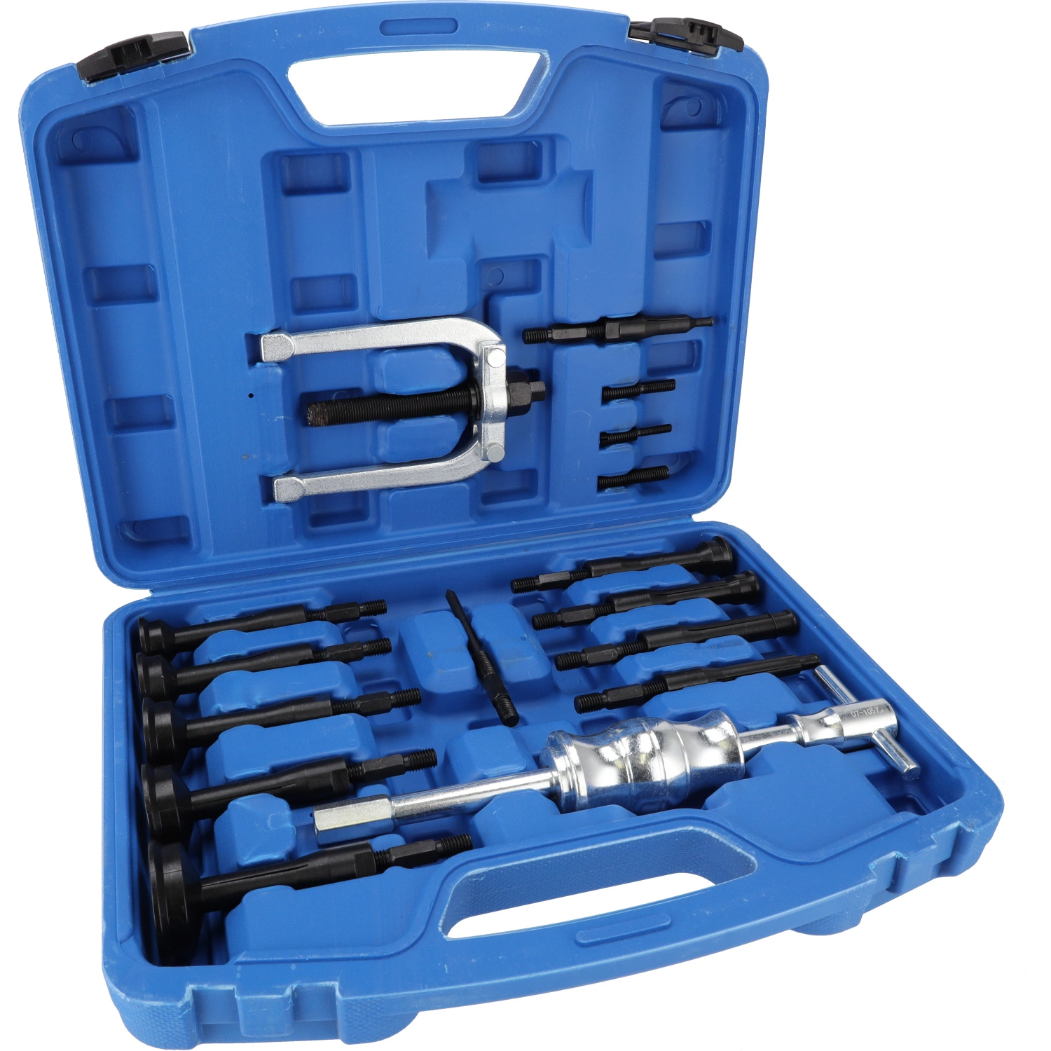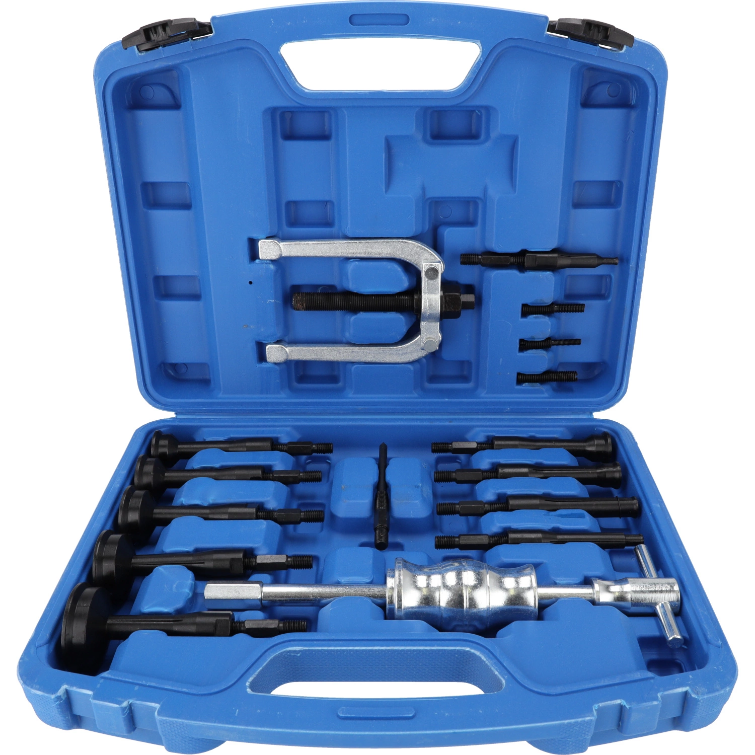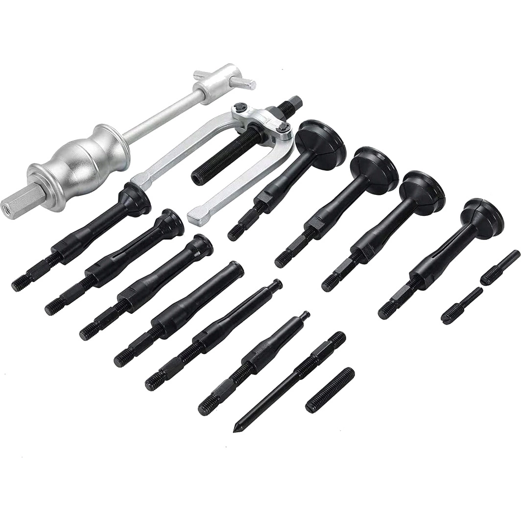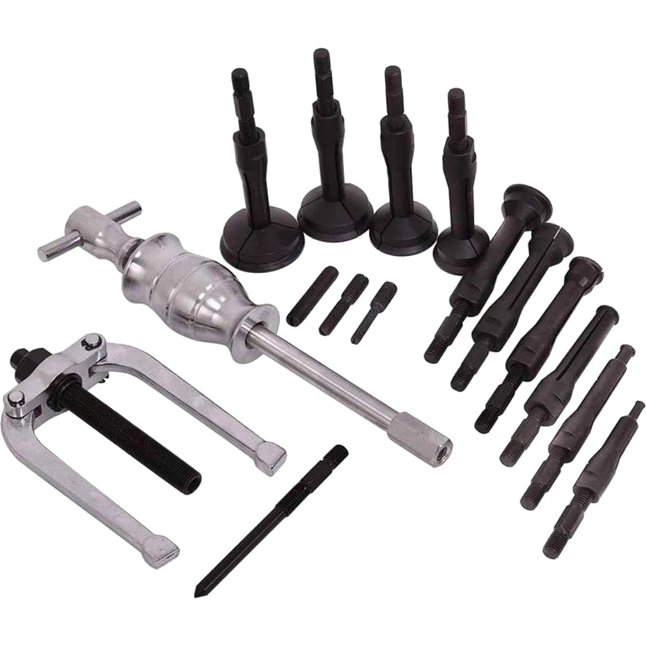 Ściągacz bezwładnościowy do łożysk 16 el. to kompletny zestaw serwisowy umożliwiający szybki, bezpieczny i skuteczny demontaż łożysk oraz innych elementów osadzonych w gniazdach bez ryzyka ich uszkodzenia.