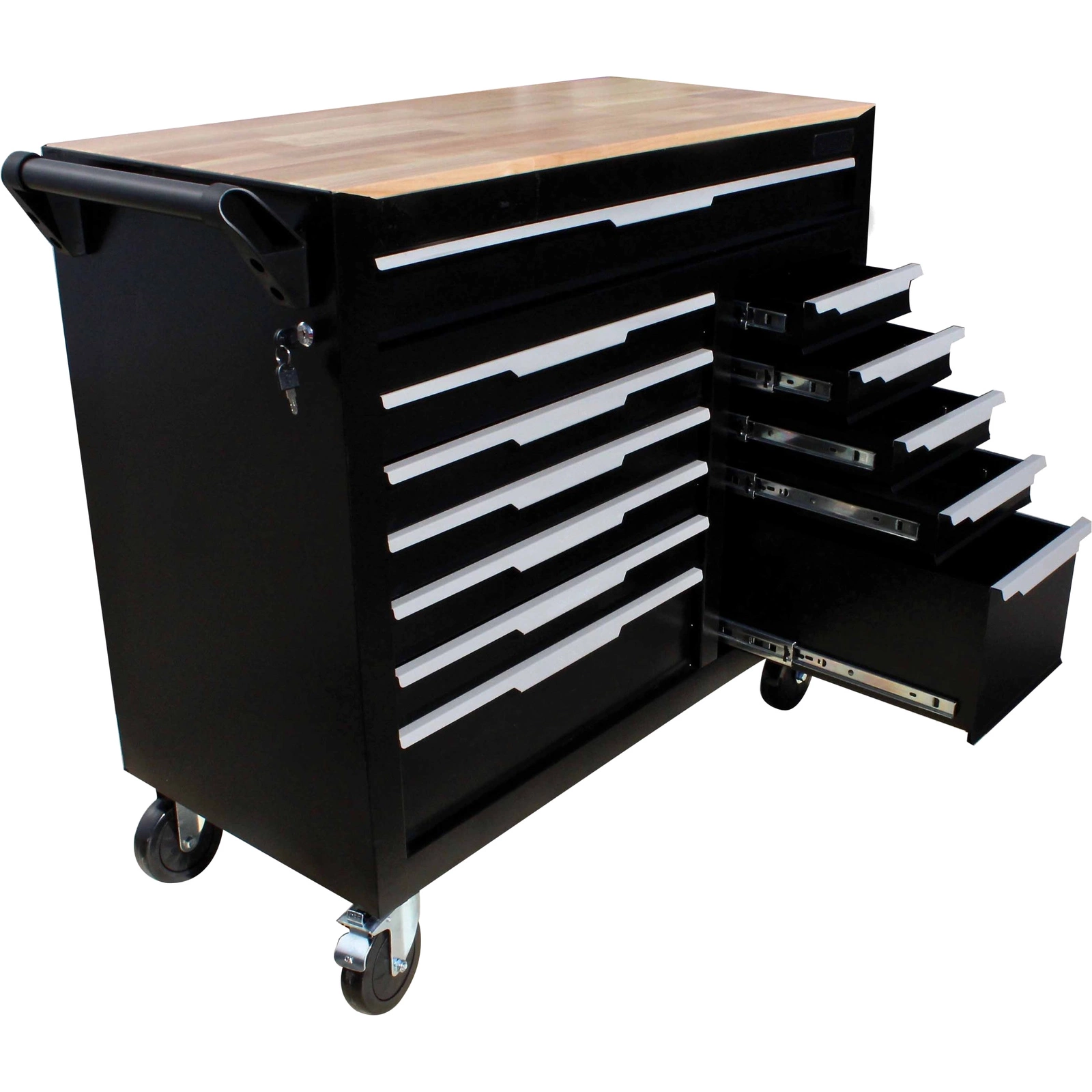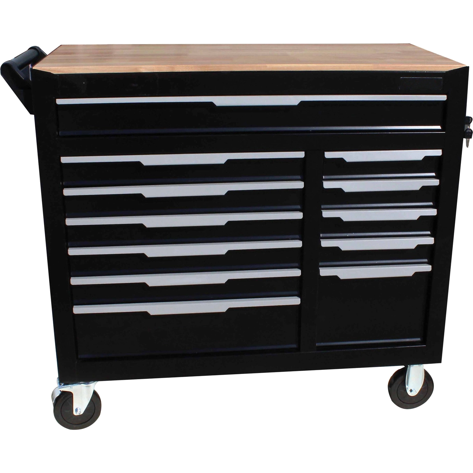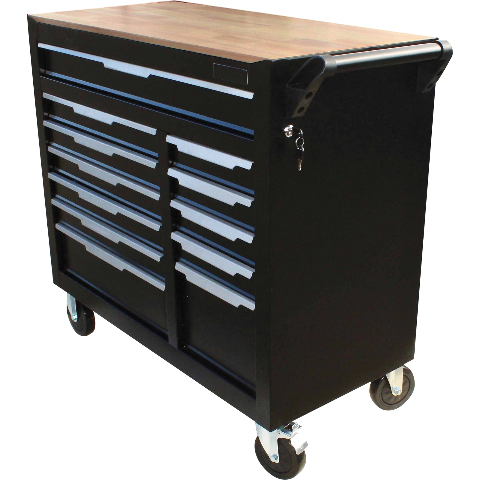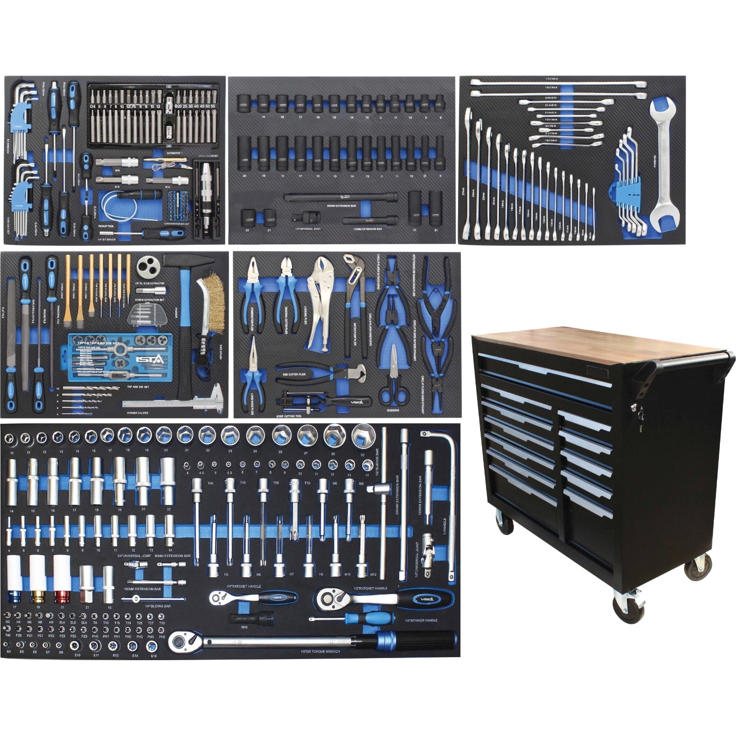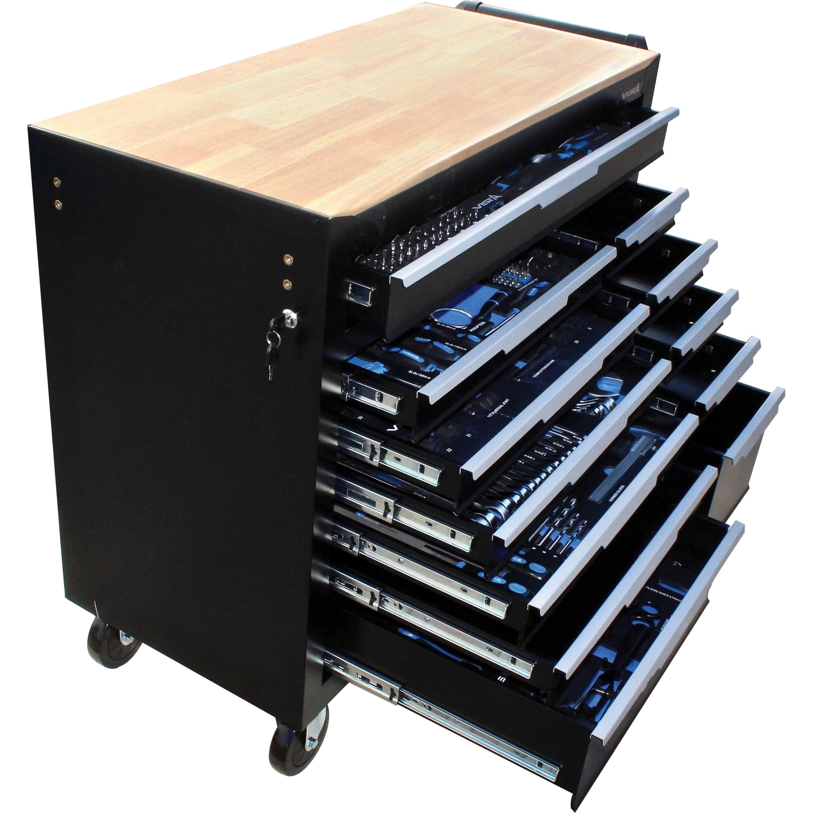 Wózek narzędziowy 12 szuflad z blatem drewnianym wyposażony jest w bogaty zestaw narzędzi umieszczony w 6 z 12 szuflad, zorganizowanych na wkładach piankowych. To idealne rozwiązanie dla profesjonalistów i majsterkowiczów, którzy cenią sobie porządek, funkcjonalność i niezawodność.