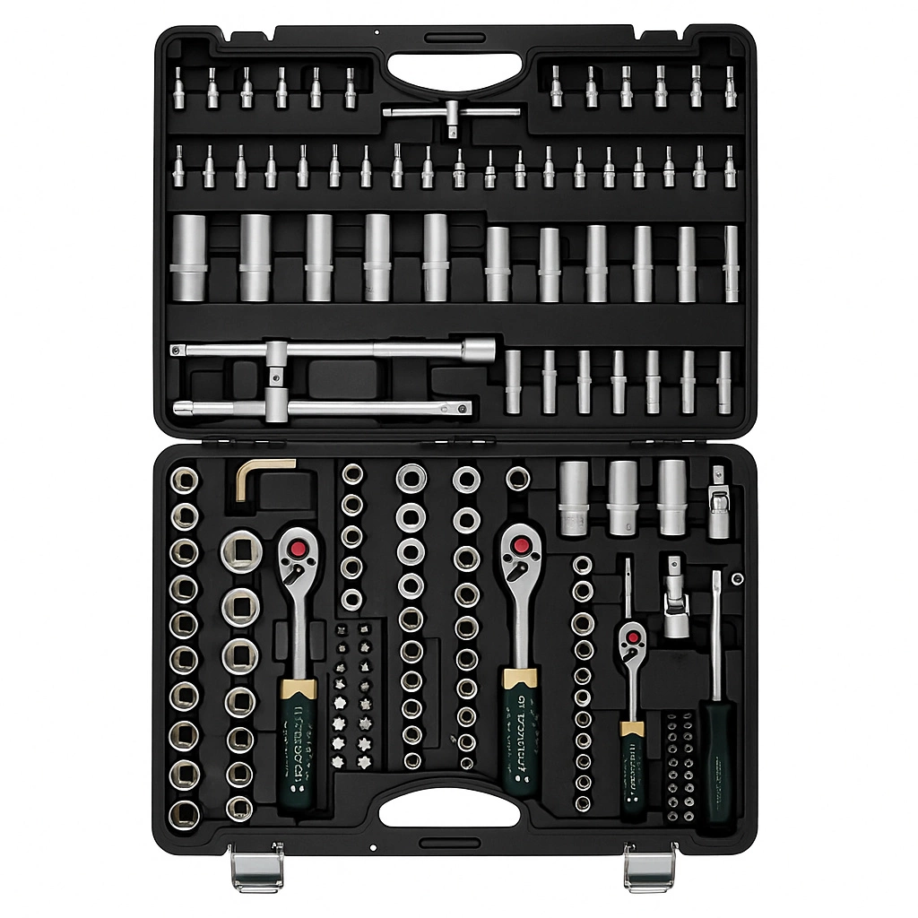 Zestaw narzędzi 179el. 1/4" 3/8" 1/2" (6-kątnych) to kompletny i profesjonalny zestaw przeznaczony do wszechstronnych prac warsztatowych i serwisowych. Wysoka jakość wykonania oraz bogaty wybór elementów sprawiają, że zestaw idealnie nadaje się dla mechaników, majsterkowiczów i użytkowników domowych.